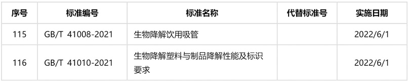 2021年11月26日,國(guó)家市場(chǎng)監(jiān)督管理總局、國(guó)家標(biāo)準(zhǔn)化管理委員會(huì)發(fā)布公告,《GB/T 41010-2021 生物降解塑料與制品降解性能及標(biāo)識(shí)要求》、《GB/T 41008-2021 生物降解飲用吸管》兩個(gè)國(guó)家推薦性標(biāo)準(zhǔn)將于2022年6月1日實(shí)施。 關(guān)于GB/