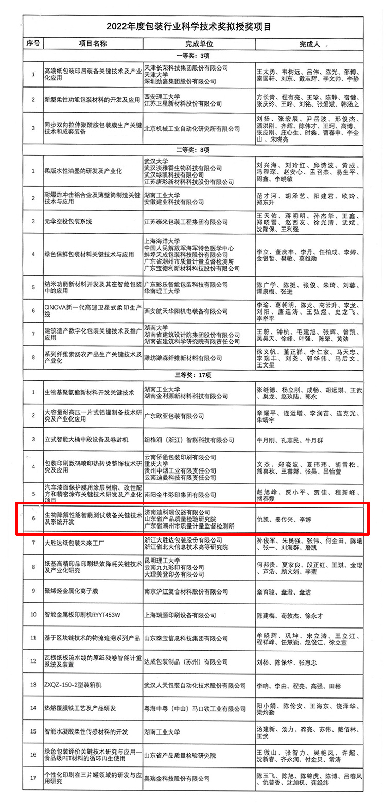 近日2022年度包裝行業科學技術獎勵管理委員會工作會議在線上召開,本年度共收到包裝行業科技獎申報項目77項,經形式審查提交專家評審項目53項。經專家評審,最終建議授獎項目28項。由濟南迪科瑞儀器有限公司作為主要完成單位申報的《生物降解性能智能測試裝備關鍵技術及系統開發》項目,獲得2022年度“包裝行業科學技術獎”三等獎。